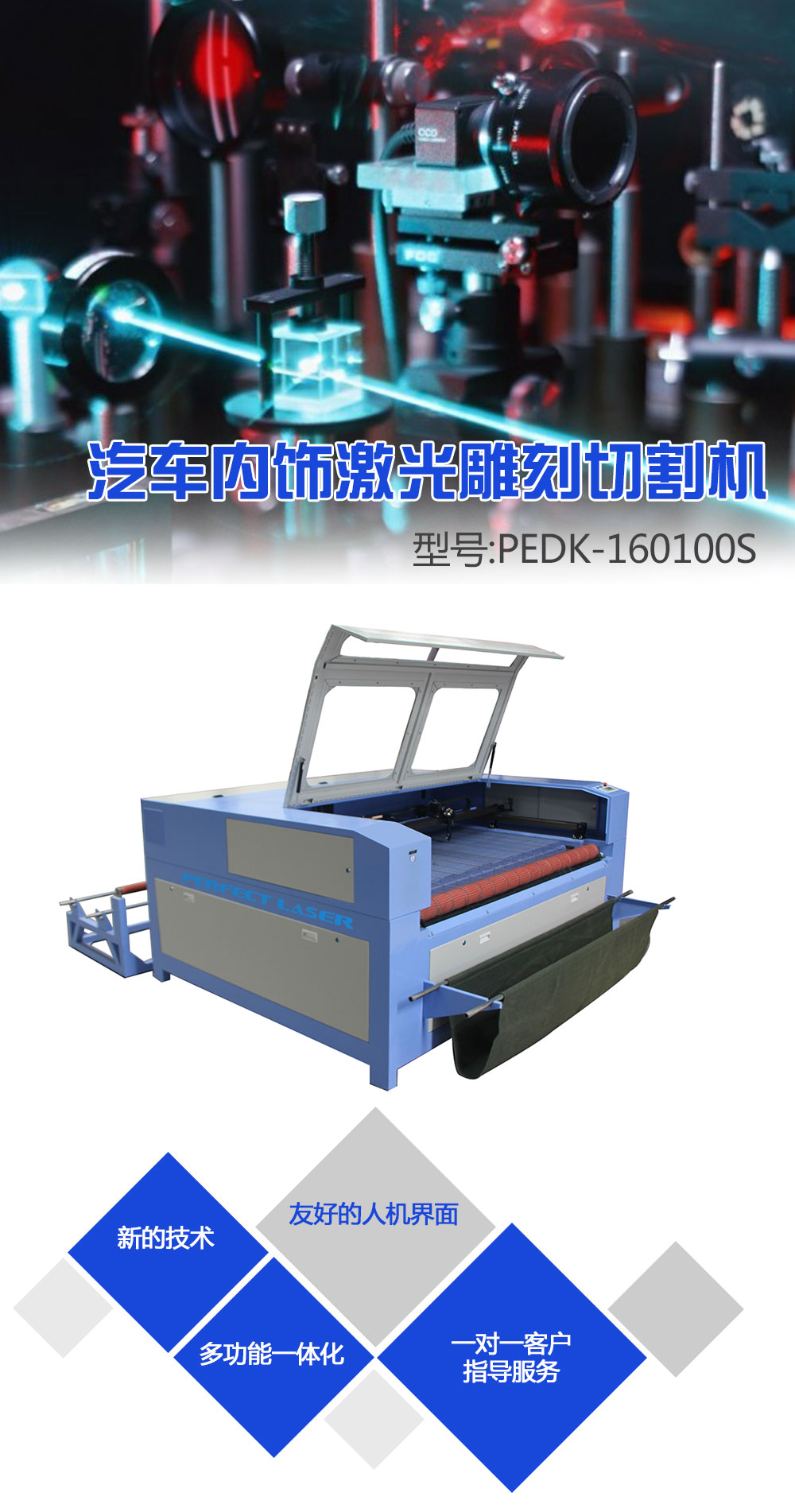此款汽車坐墊激光切割機(jī)是主要針對(duì)汽車座套等汽車內(nèi)飾材料裁剪而設(shè)計(jì),可對(duì)寬幅1600mm以內(nèi)各類汽車內(nèi)飾材料進(jìn)行切割加工。搭配自動(dòng)送料裝置,實(shí)現(xiàn)精準(zhǔn)送料,高質(zhì)量加工。