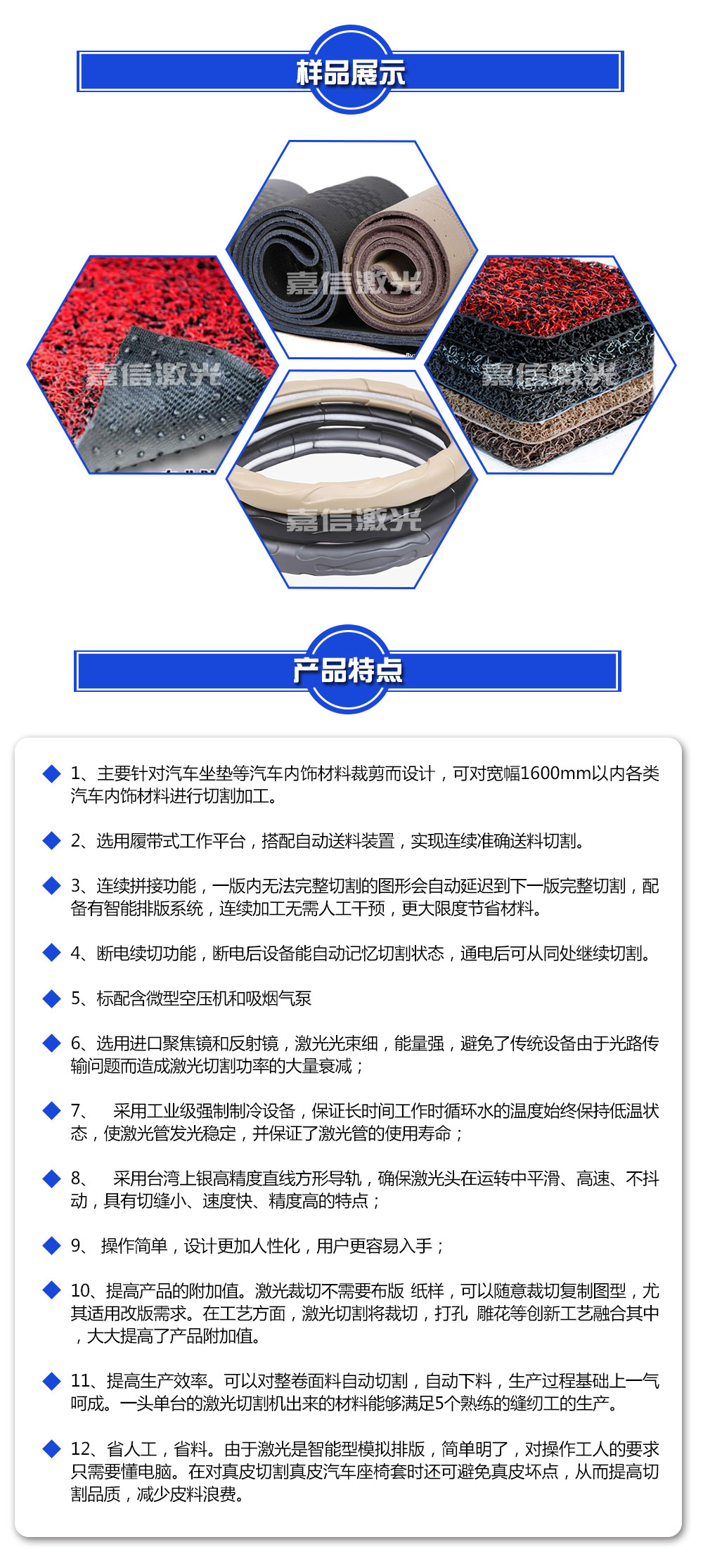 1.該汽車坐墊激光切割機(jī)主要針對(duì)汽車座套等汽車內(nèi)飾材料剪裁設(shè)計(jì),寬幅1600毫米以內(nèi),采用履帶式工作平臺(tái),搭配自動(dòng)送料裝置,實(shí)現(xiàn)連續(xù)精準(zhǔn)送料切割。