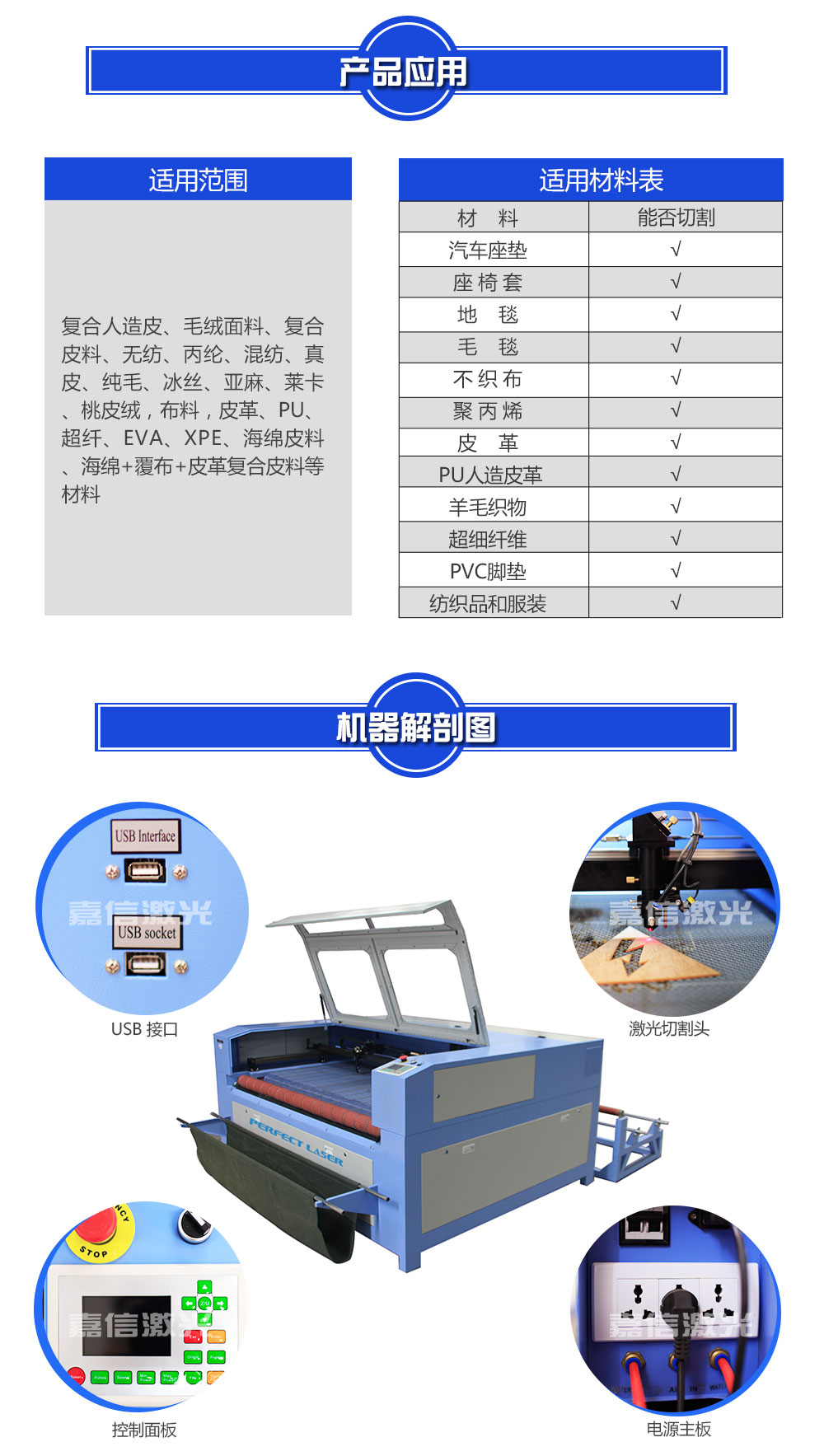 1.適用材料:復(fù)合人造皮、毛絨面料、復(fù)合皮料、無紡、丙綸、混紡、真皮、PU,純毛、冰絲、亞麻、萊卡、桃皮絨,布料,皮革、PU、超纖、EVA、XPE、海綿皮料、海綿+覆布+皮革復(fù)合皮料等材料