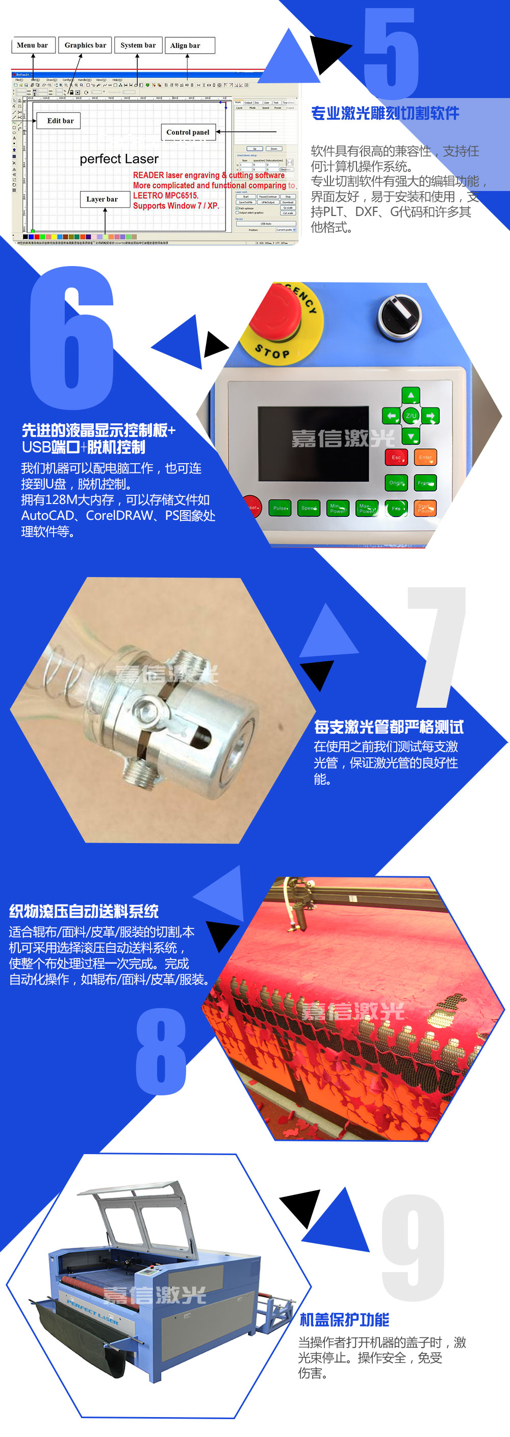 2.連續(xù)拼接和智能排版:一版內(nèi)無法完整切割的圖形會(huì)自動(dòng)延遲到下一版完整切割,配備有智能排版系統(tǒng),連續(xù)加工無需人工干預(yù),更大限度節(jié)省材料。一臺(tái)單頭的汽車坐墊激光切割機(jī)出來的材料能夠滿足5個(gè)熟練的縫紉工的生產(chǎn)。