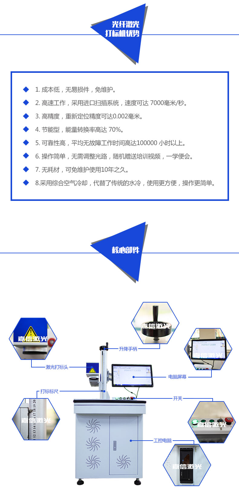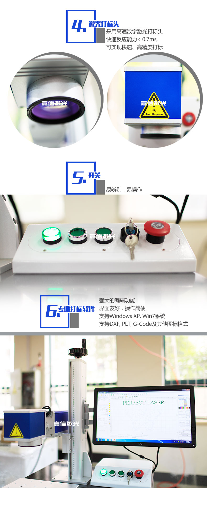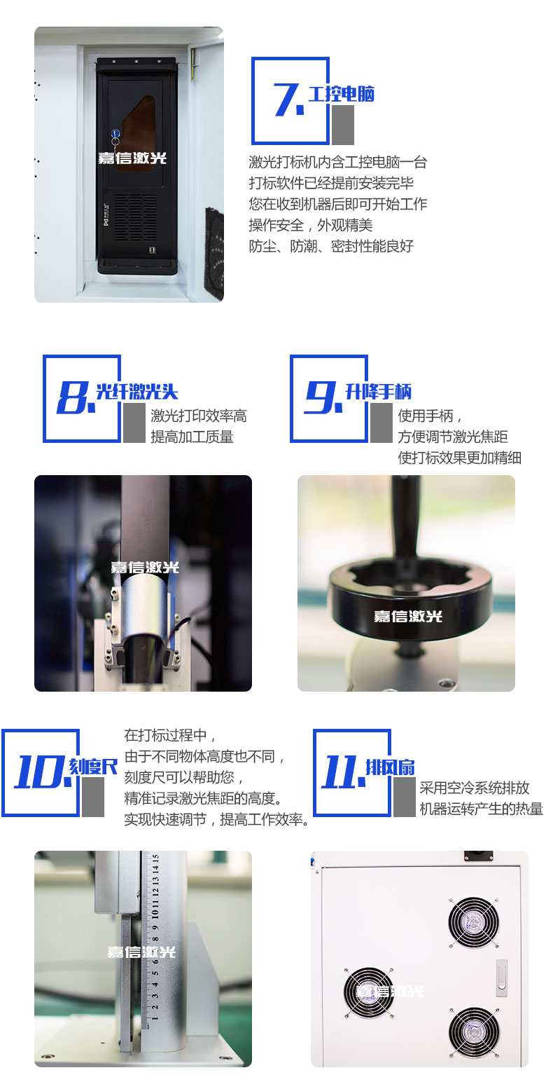 嘉信激光公司制造團(tuán)隊(duì)制造出該款立柜式光纖激光打標(biāo)機(jī),充分考慮操作人員的使用體驗(yàn),參考友好型人性化設(shè)計(jì)的原理,擁有如此人性化的設(shè)計(jì)之外,該機(jī)器更是配置進(jìn)口激光器,光束質(zhì)量?jī)?yōu)越,配合嘉信的打標(biāo)軟件,提供更好的打標(biāo)行業(yè)解決方案。
