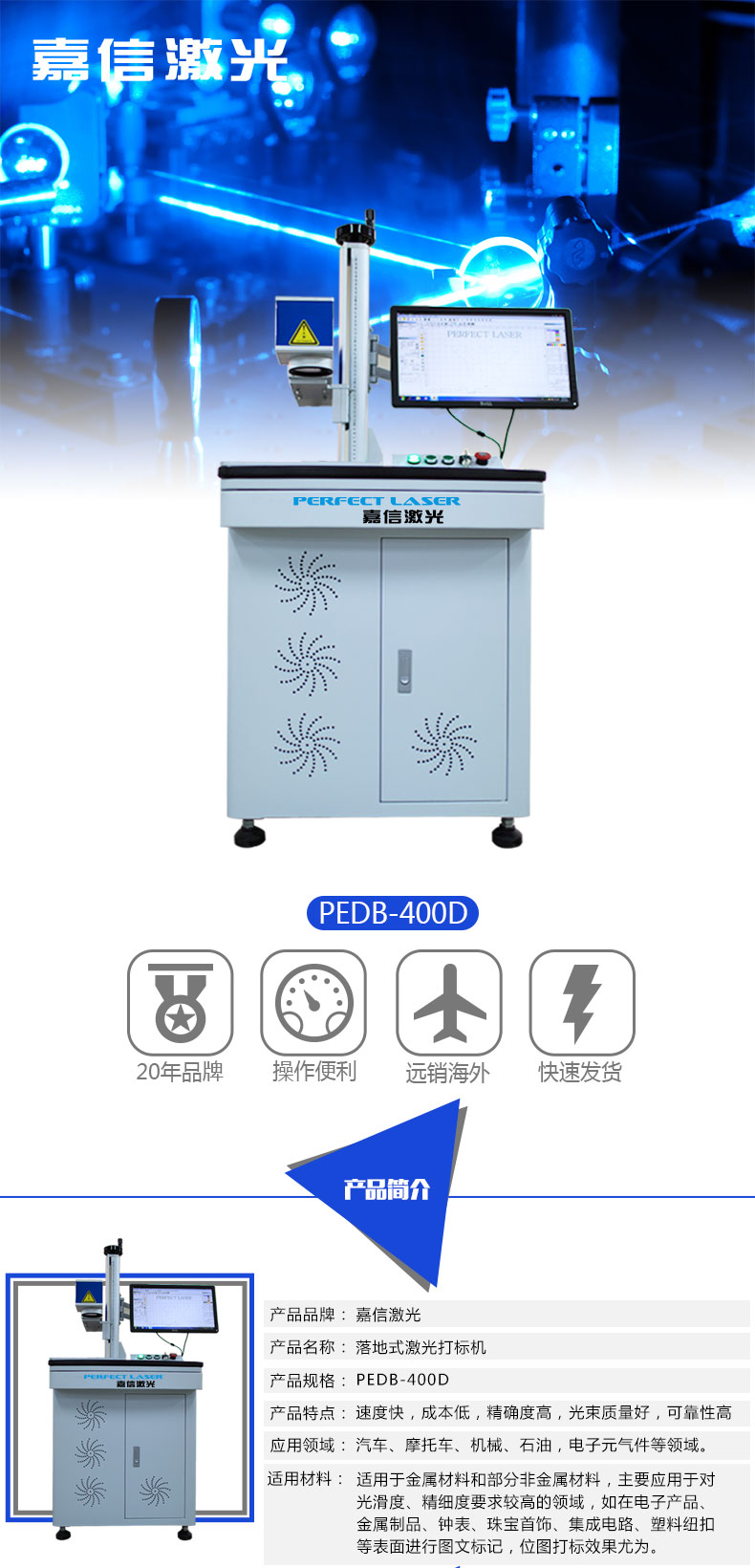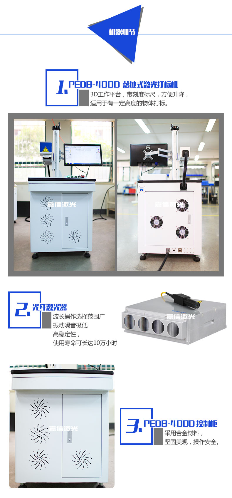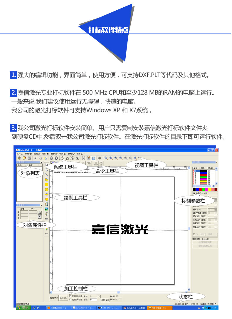 嘉信激光公司制造團(tuán)隊(duì)制造出該款立柜式光纖激光打標(biāo)機(jī),充分考慮操作人員的使用體驗(yàn),參考友好型人性化設(shè)計(jì)的原理,擁有如此人性化的設(shè)計(jì)之外,該機(jī)器更是配置進(jìn)口激光器,光束質(zhì)量?jī)?yōu)越,配合嘉信的打標(biāo)軟件,提供更好的打標(biāo)行業(yè)解決方案。