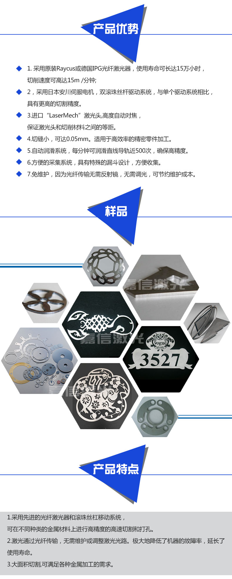 1. 切割速度快:金屬光纖切割機(jī)切割速度不直接接觸切割材料,切割產(chǎn)品表面無毛刺,金屬光纖切割機(jī)加工1mm厚度不銹鋼每分鐘可達(dá)60米;