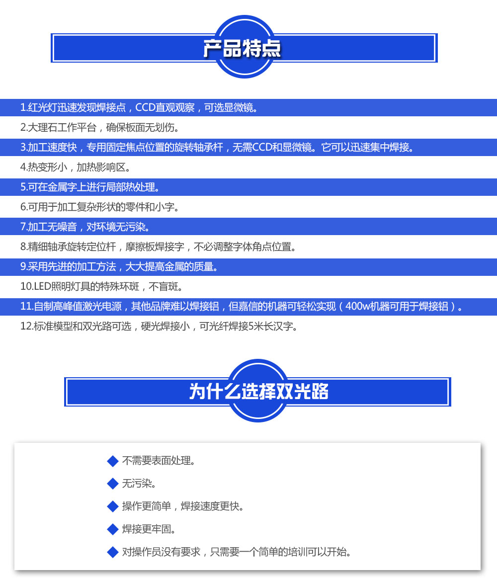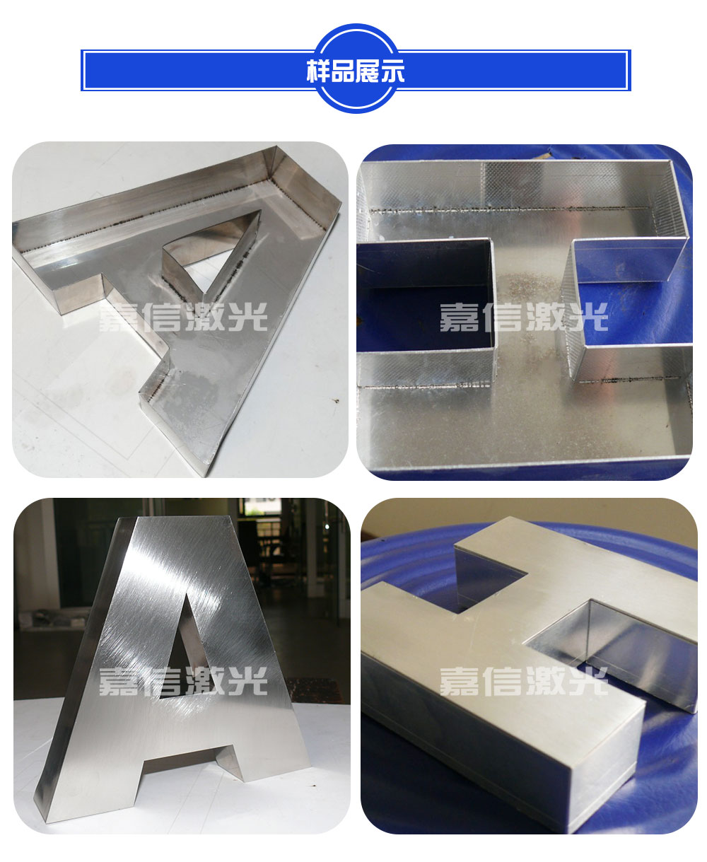4)適用性廣:單光路廣告激光焊字機(jī)可焊接0.2mm-1.2mm厚的材料,可焊接3cm-150cm大小的字體;