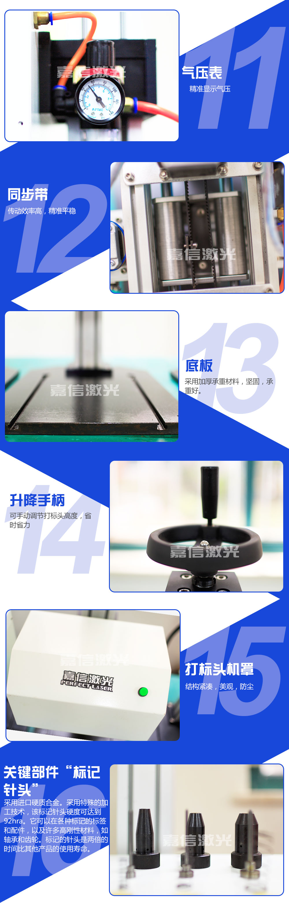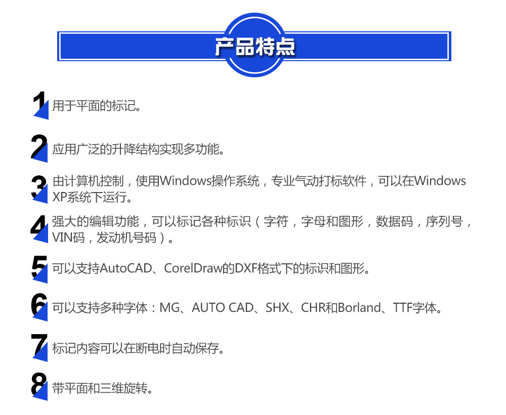 1. 旋轉(zhuǎn)氣動(dòng)打標(biāo)機(jī)標(biāo)記的字符大小、間距在幅面內(nèi)可任意調(diào)節(jié);